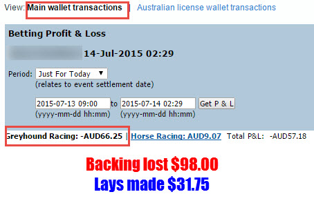 Please remember that the software is a loss recovery staking plan, so set a stop loss that you are comfortable. Don't try and set a target too high for your Stop Loss, and remember your Stop Loss is not your Bank. You can read more on this in the User Guide within the software. On a Laying Stop loss of $100.00, can result in a loss of $300.00 (100x 2 (3.00) dog.) Today (13th July, we have had the longest run of losing lay bets at 4, in 170 bets.) If the back bets Stop loss was set at 50, then I would have had one only stop loss, as as 100 but saving a 53 point loss. 50 stop will still get you covered for around 12 losing bets. So you may want to look at a lower stop loss on the backs. The results below are UK Racing Only.